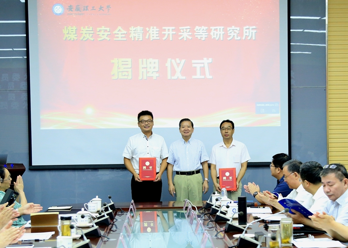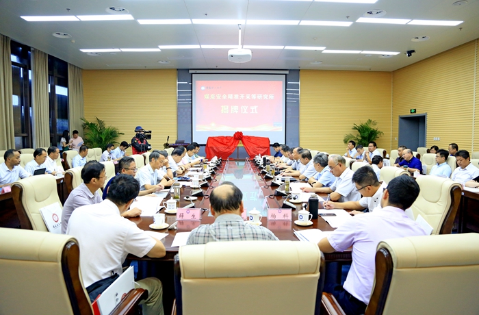 郑明东宣读成立煤炭安全精准开采等6个研究所文件,汪旭光院士和邓建军院士为6个研究所揭牌。